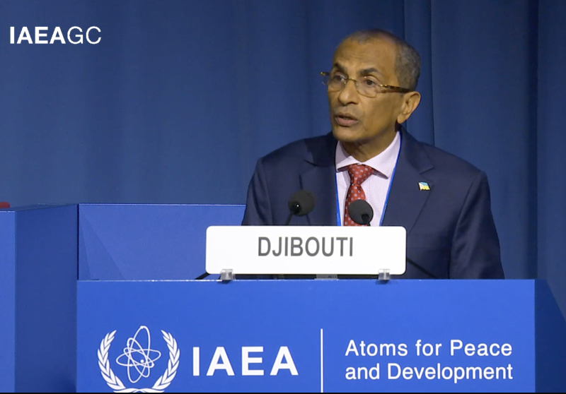 In seiner Rede vor der Generalversammlung erklärte der Minister, dass sich Dschibuti für die friedliche Nutzung der Kernenergie ein setzt, den Atomwaffensperrvertrag unterstützt und den Atomwaffenverbotsvertrag unterzeichnet hat. Das Land arbeite mit der IAEO zusammen, um nachhaltige Entwicklung zu fördern, und plane den Bau eines nationalen Strahlentherapiezentrums für Krebspatienten. Darüber hinaus nutzt Dschibuti nukleare Technologien in der Landwirtschaft und im Umweltschutz, hat neue Gesetze für nukleare Sicherheit eingeführt und unterstützt die Initiativen IAEO-Programme ZODIAC (Gesundheitskrisenprävention)  und NUTEC PLASTICS (Plastikmüllreduktion).